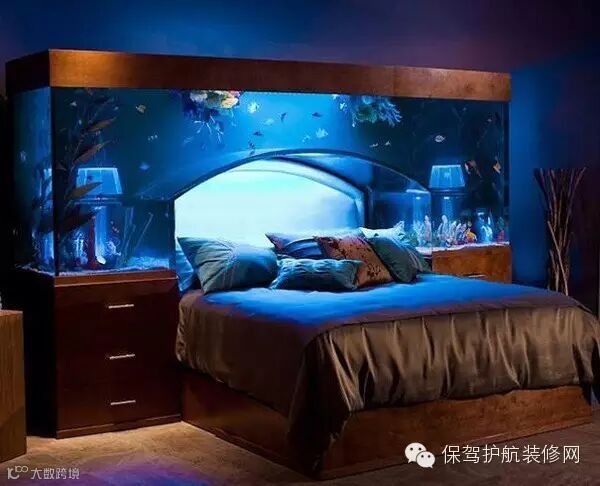 水族馆床头板,让你置身梦幻的海洋世界里,这样的设计,的确很新颖。不过在睡觉的地方弄个这么大的水缸,总觉得有点阴潮。