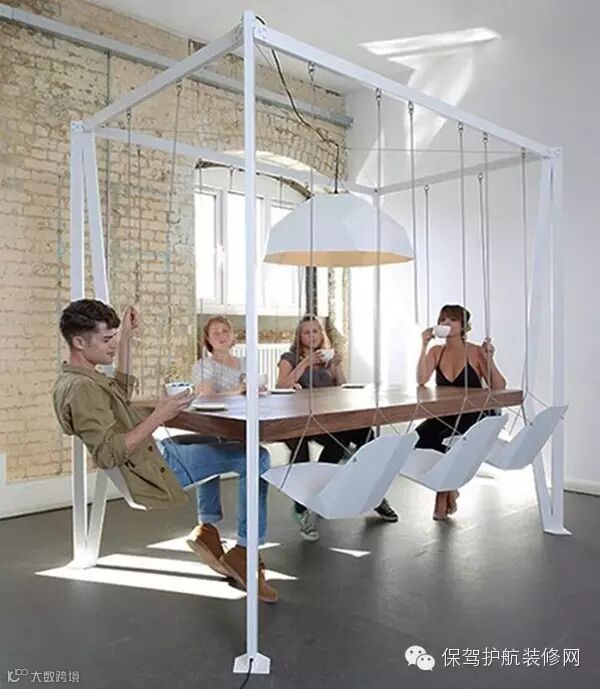 最酷的秋千晚宴桌,每一个椅坐都是秋千,坐在餐桌上,慢慢品味美食,慢慢的摇动椅子,应该是一种很舒服的享受吧!