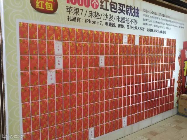 活动期间,商场通过设置红包墙,凡在参加活动的专卖店内购物并到一楼收银台缴款,缴款满5000元,并填写一份调查问券即可获得抽红包机会。顾客每缴满5000元可抽一次,单个客户单笔最高可抽取5次。每天限抽300个红包,抽完即止。