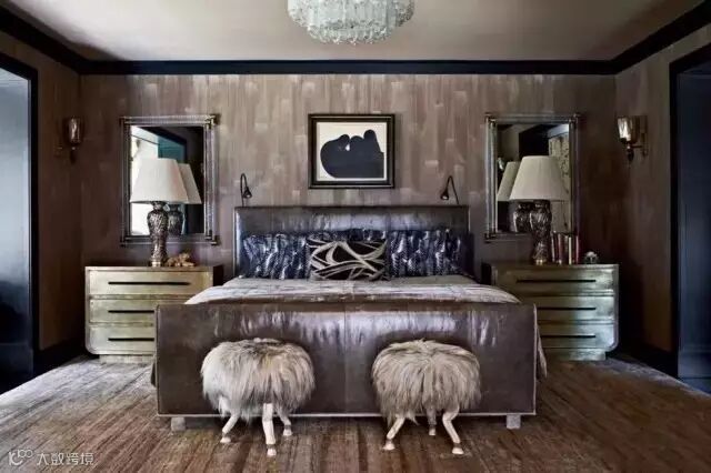 从地面到墙面,都保持统一的棕色调,深邃而沉静,整间卧室散发着沉木的迷人香气,墙面上一副抽象画作品,更添喜怒无常、迷人的氛围。