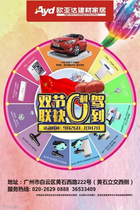双节期间,欧亚达建材家居引爆“双节联袂,0利驾到”活动!只要到店参与,缴款满1000元即可轻松参与抽奖环节,就有机会赢取一等奖iphone6S一台!