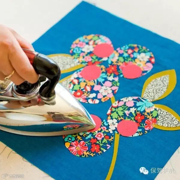 准备好的图案平放在蓝色麻布上,用熨斗熨平,使两者完全贴合。
