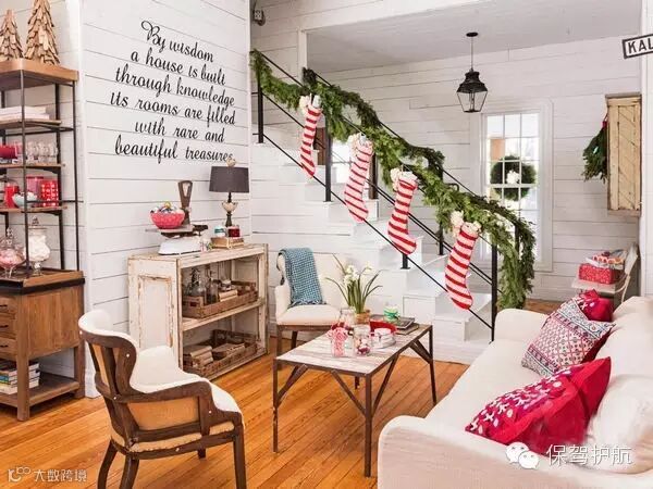 如果你家是复式楼,或者双层楼,有楼梯的话,楼梯的圣诞装扮也不要忽略哦,你可以在楼梯扶手处系绑一些圣诞铃铛或者藤条,让整个居室更加温馨。