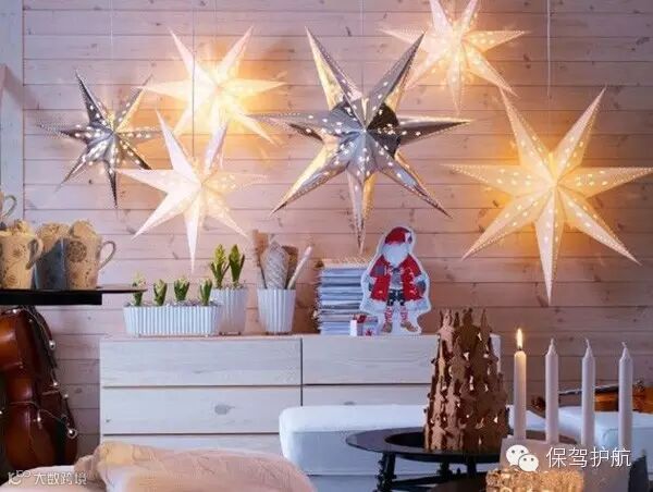房间的吊顶上你可以悬挂一些白色的雪球、雪人儿、雪花片儿、还有一些水晶球等。如果你家里有小孩的话,也可以摆放上一些小礼物哦,给家人一份惊喜,让整个圣诞节多几分愉快的心情吧。