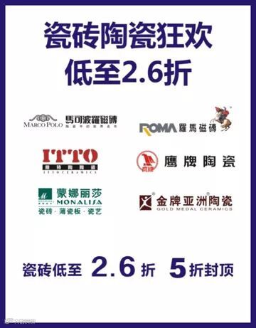 购物狂欢没有极限!马可波罗、罗马、ITTO、鹰牌、蒙娜丽莎、金牌亚洲瓷砖低至2.6折,5折封顶!