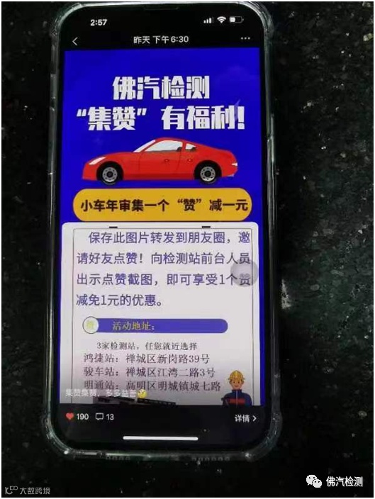 2023年10月28日上午,一位梁小姐驾爱车到鸿检测站年审,转发我司的活动海报到朋友圈,动员圈内的朋友点赞,太给力了,集了190个赞,梁小姐审完车到前台即可立减190元审车费。梁小姐激动地说,“你司的集赞活动的搞得很好,很实惠!以后我或亲戚朋友需要审车的话,一定继续选择你们公司的。”