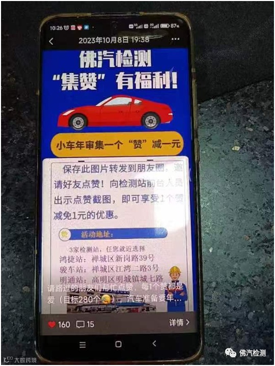 2023年10月28日上午,一位梁先生驾爱车到鸿检测站年审,转发我司的活动海报到朋友圈,动员圈内的朋友点赞,轻松集了160个赞,梁先生审完车到前台即可立减160元审车费。梁先生高兴地说,“你司的集赞活动的很不错,是实实在在给客户的优惠!以后我需要审车的话,一定继续“帮衬”你们公司的。”