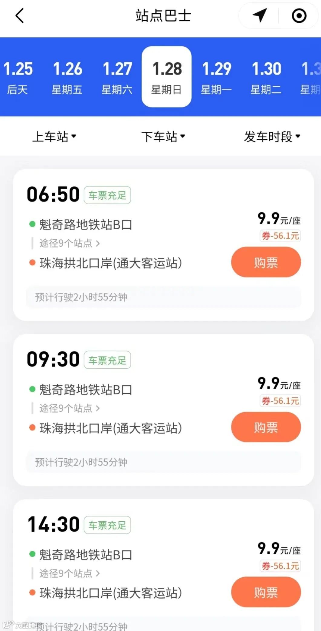 一、购票通过滴滴出行APP或小程序进入站点巴士平台,到达城市搜索【珠海市】,日期选择1月28日及以后,往返车票都已上线,点击下方进入购票渠道
