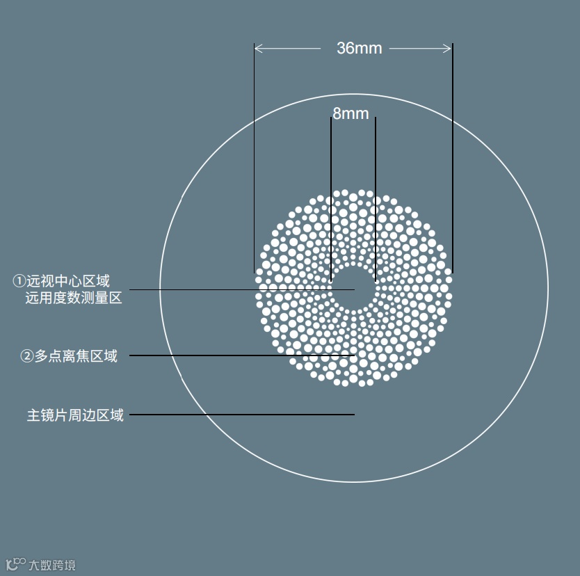 派多分镜片上设有16个辐射环阵同心圆,内含432个微透镜,且微结构区域面积占镜片总面积比例为20%,微透镜附加屈光度为+3.50D。镜片由主透镜区域和微透镜阵列区域组成。