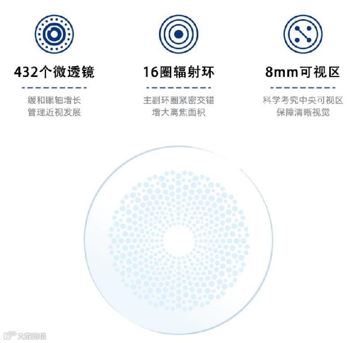 根据辐射环阵离焦控制技术原理(即近视离焦),在镜片上设计16圈的主附辐射环圈,叠加432个有规律正度数微透镜(+3.50D),将周边区域成像在视网膜前达到膜前离焦的效果,通过微透镜数量和主附辐射环圈的设计,增加有效离焦面积,更好地抑制眼轴增长,从而起到延缓孩子近视加深的作用。