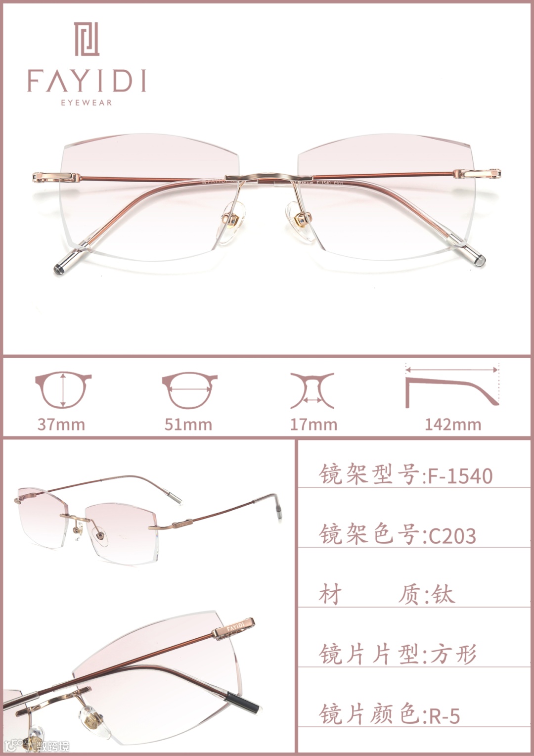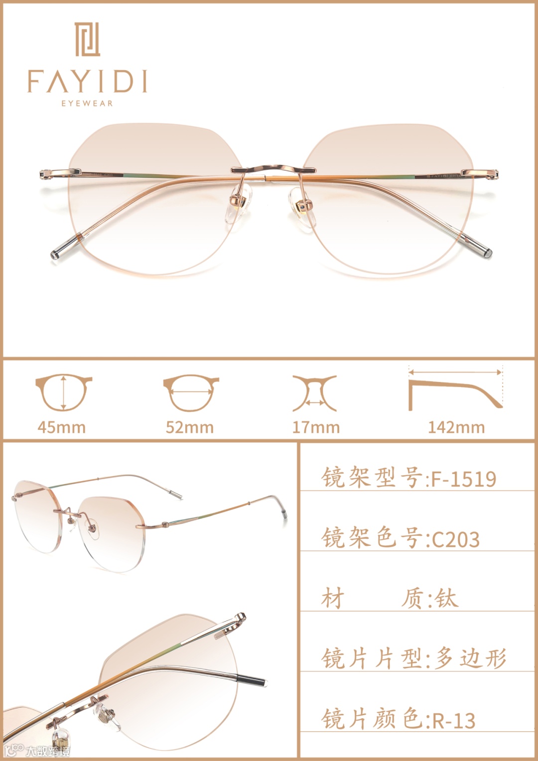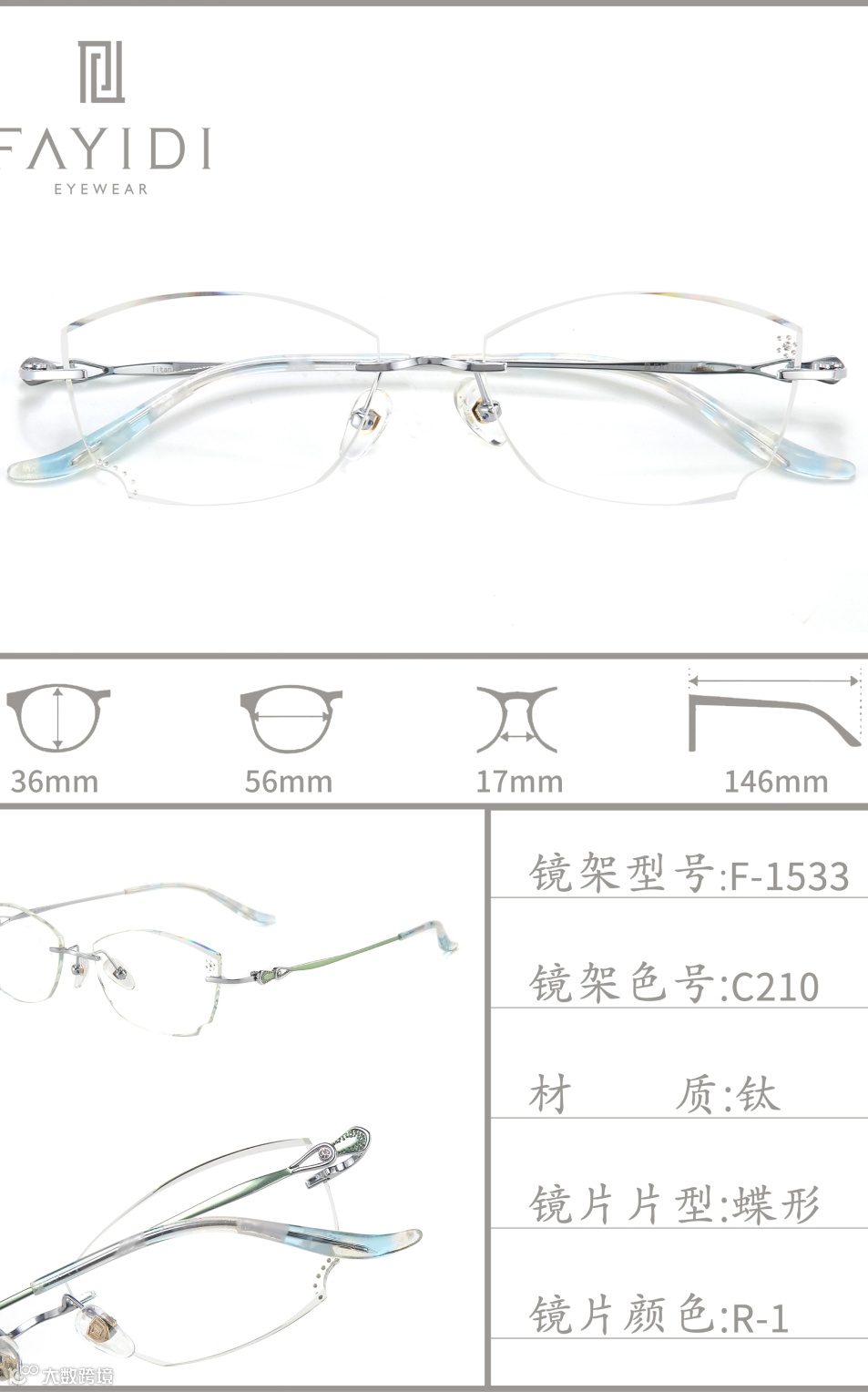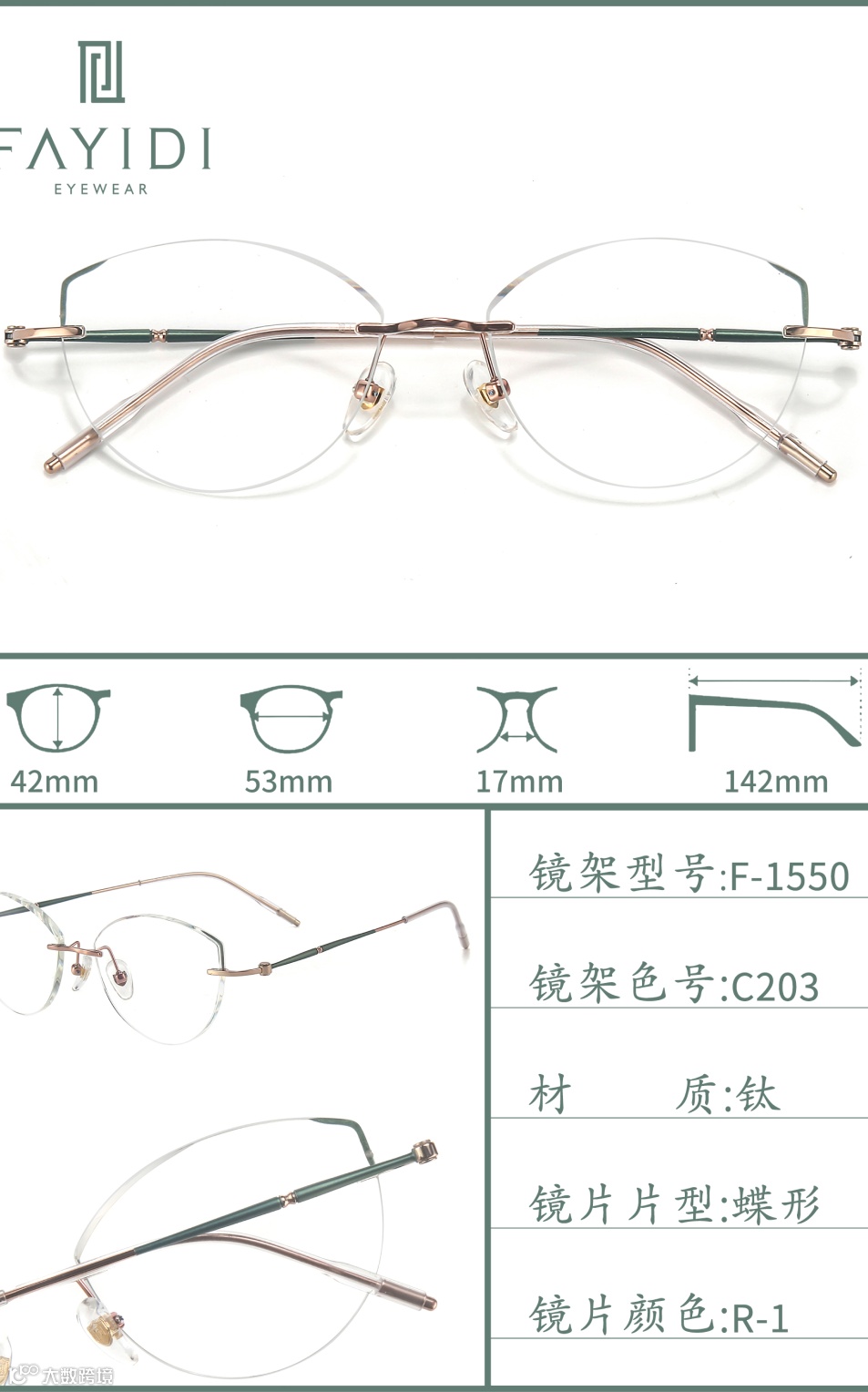 (专利号202220004546.4):通过切削工艺将镜片延伸凸部弄薄,让无框眼镜视觉上更轻薄,尤其适配高度数镜片,解决了传统无框眼镜桩头安装处显厚的问题。