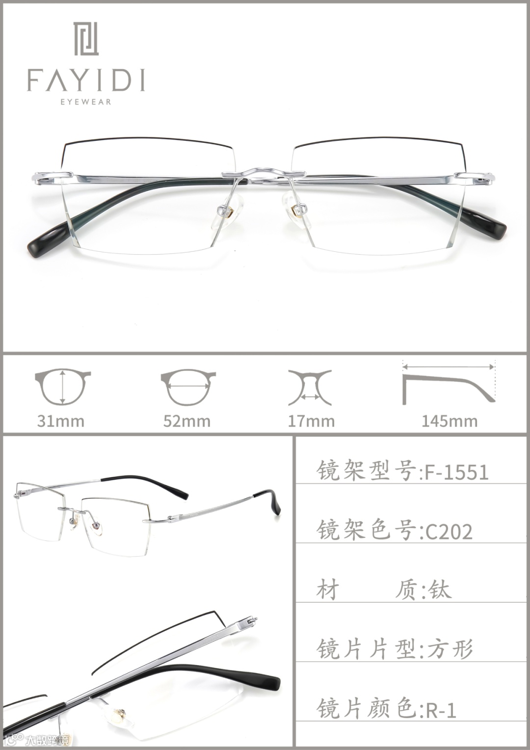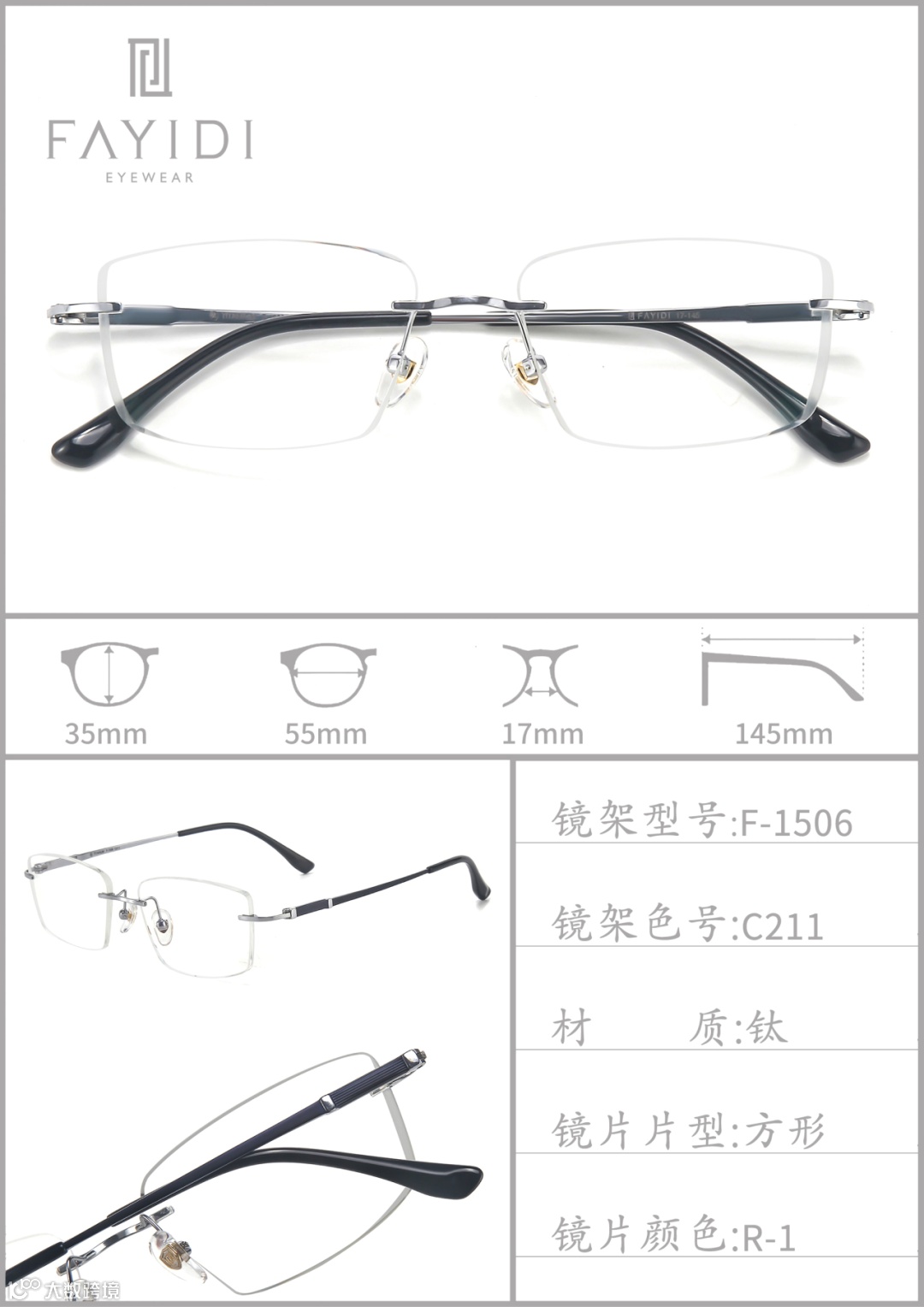 (专利号201510110026.6):镜片内开槽且薄镜片槽宽仅1mm,不用螺丝螺帽固定镜架与镜片,让眼镜更轻薄,还解决传统眼镜螺丝易松动的问题。