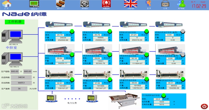 纳德长期致力于抛光整线装备与技术上的不断创新与摸索,结合行业转型升级的需要,在陶瓷抛光整线装备的数字化、信息化、智能化应用等方面均已达到行业领先水平,纳德集中管控和集中采集系统在抛光整线装备中的应用,为实现陶瓷岩板深加工全流程的智能化制造提供了样板级的成套配置,纳德本次为领标科技公司提供的大岩板抛光整线装备具备以下智能化特征:
