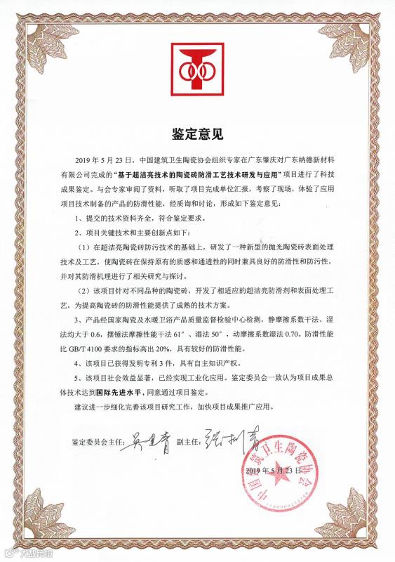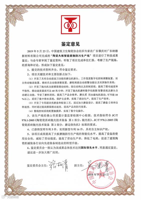 2019年5月,纳德《大板智能磨抛防污生产线》项目、《基于超洁亮技术的持久防滑功能陶瓷砖工艺技术研发与应用》项目通过国家级科技成果鉴定,总体技术分别达到国际领先和国际先进水平。