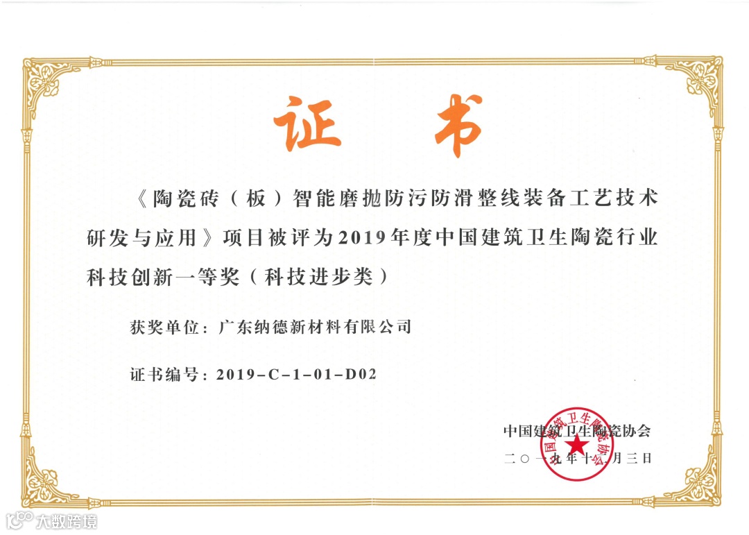 同年,纳德《陶瓷砖(板)智能磨抛防污防滑整线装备工艺技术研发与应用》荣获2019年度中国建筑卫生陶瓷行业科技创新一等奖。