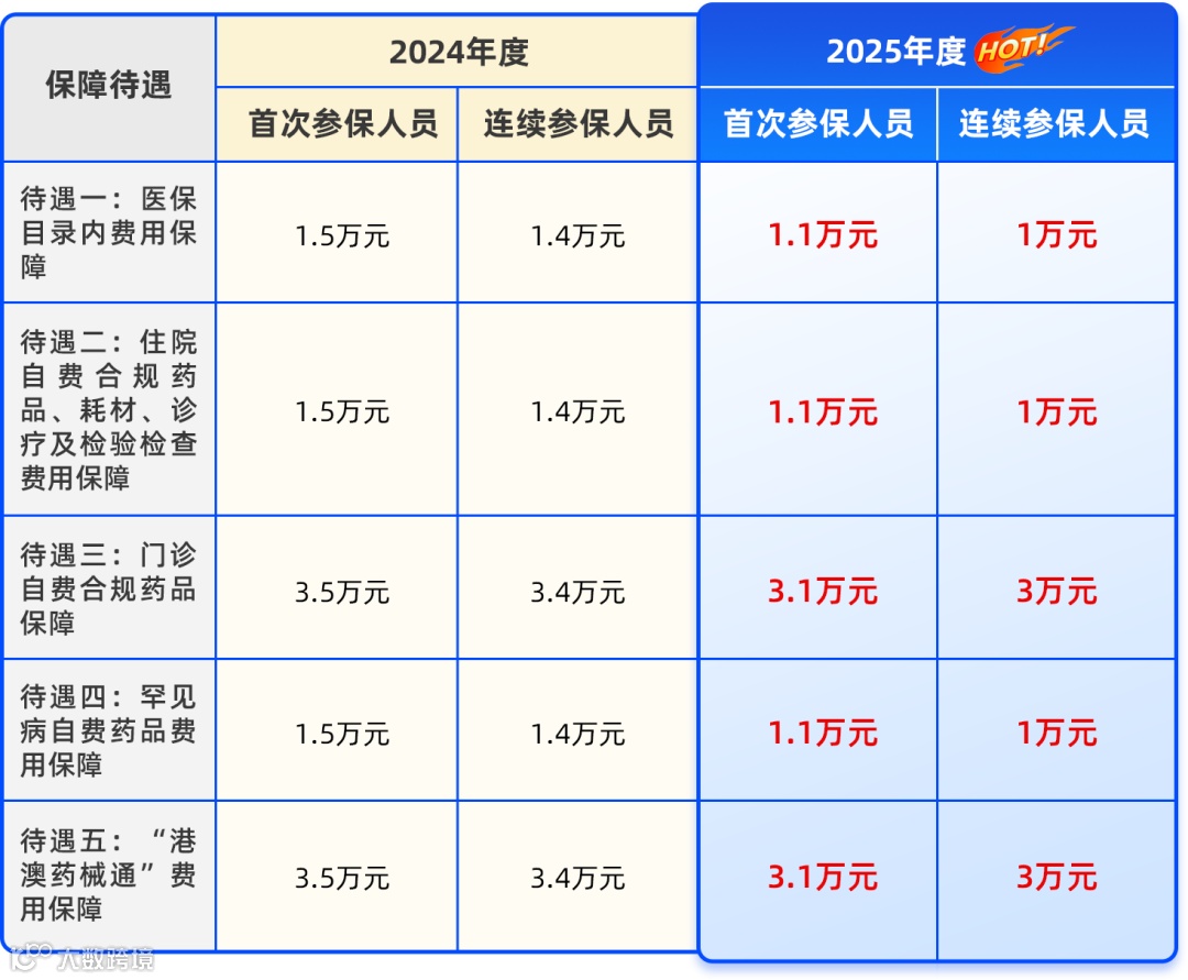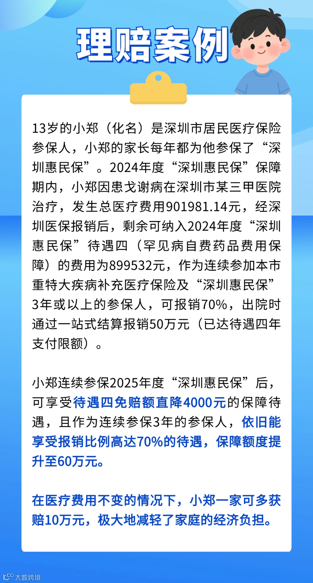 在免赔额方面,2025年度“深圳惠民保”与去年同期相比,待遇一至待遇五的免赔额各下调4000元。此外,对于连续2年及以上参保“深圳惠民保”的人群,上述免赔额还能再降1000元。