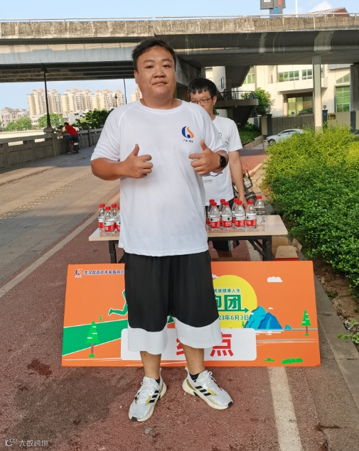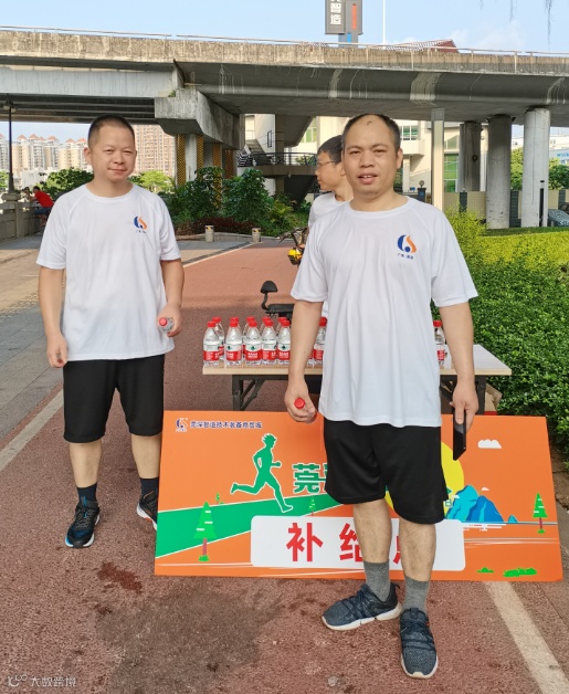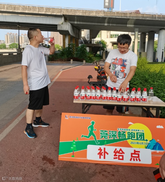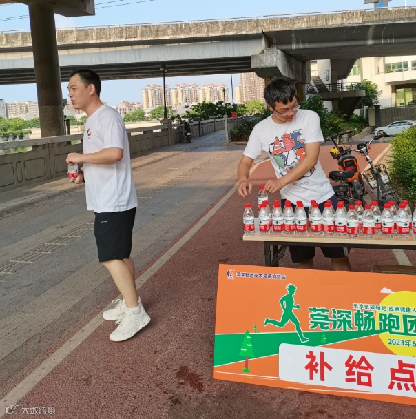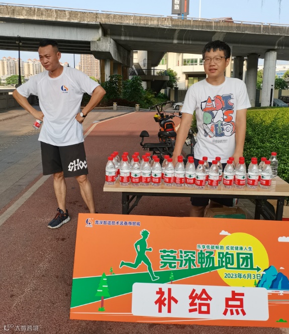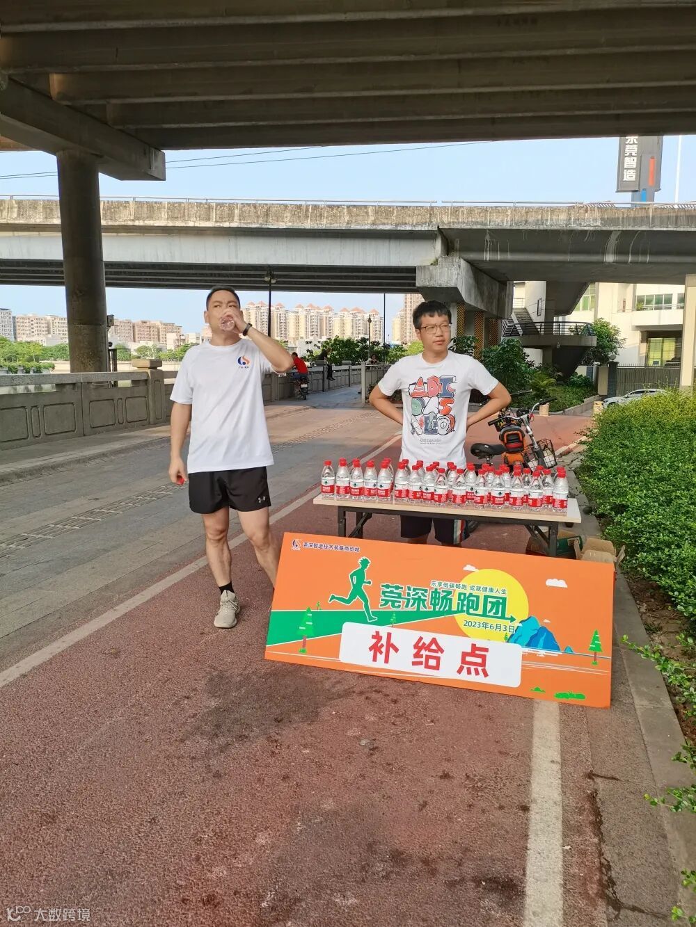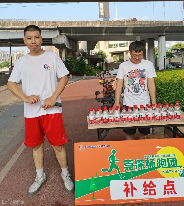 商户们列队跑步至折返点,可免费享用由莞深提前设置的补给饮用水。折返点还设置了拍照打卡,吸引了参与活动商户依次打卡。统计时间显示:出发后不到20分钟,第一批次商户即跑到了折返点!以下是部分率先抵达补给点商户英姿,让我们先睹为快吧~