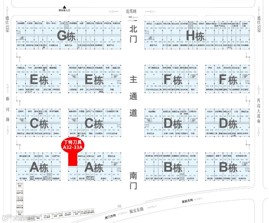 丁特刀具莞深旗舰店,位于莞深商贸城A栋中间通道后侧(六方晶门店背后原子和刀具位置),门店位置优越、门口看见丁特刀具大店招入内即是。