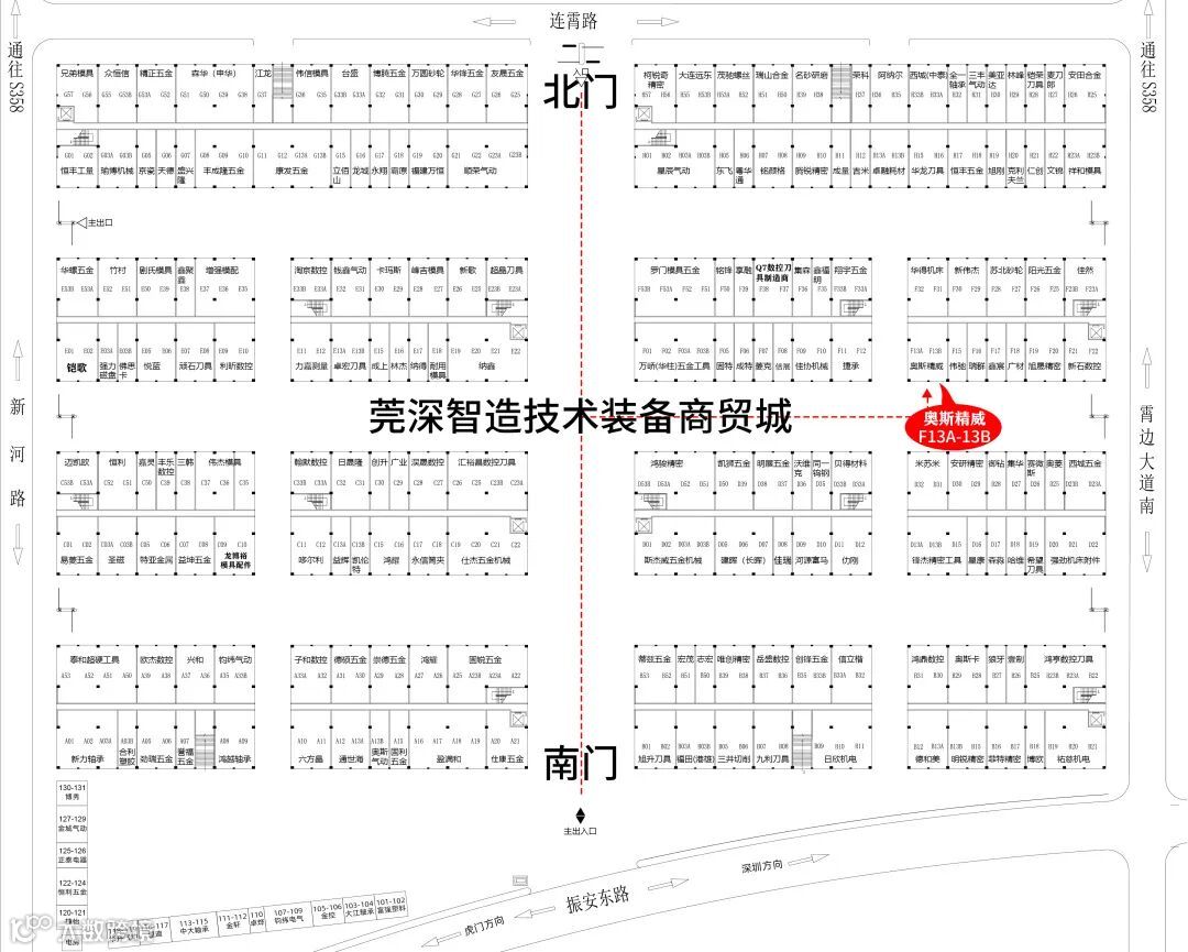 奥斯精威铺面,从莞深智造商贸城一期南门主通道直进至F栋与D栋的通道中央靠F栋一侧位置即是。
