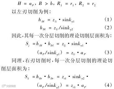 由于粗加工及半精加工工序结束后,外螺纹的径向尺寸和形状尺寸达到精加工要求,因此大螺距螺纹精加工时,只采用左右切削刃沿轴向交替多次进刀分层切削的方式去除工序加工余量,直至左右螺纹面已加工表面粗糙度和螺纹中径误差控制在预定加工质量指标以下为止.由图1可知,轴向分层切削方式为全刃参与切削,在每一次进刀过程中,切深ap不变并且等于螺纹牙高H,切削层面积只与轴向单次加工余量有关,其变量间关系如下所示: