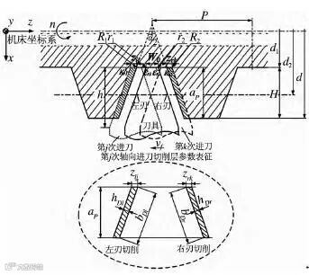 由上述公式可知,该切削方式采用的是全刃切削,其每一次进刀后,参与切削的切削刃长度不变,切削时的切削层面积与轴向单次加工余量和总径向切深有关.因此,采用轴向分层切削方式精加工大螺距螺纹时,其螺纹表面形成与刀具左右切削刃的状态有密切关系.