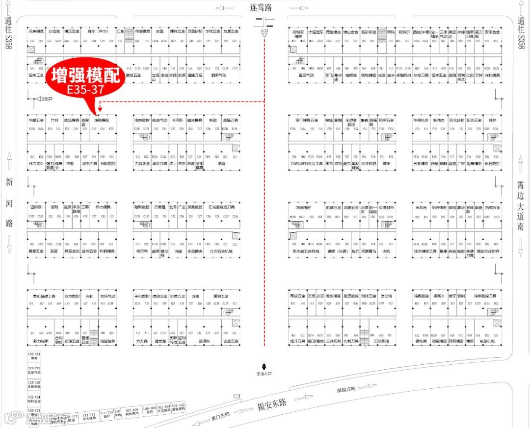 增强模配铺面,从莞深智造商贸城1期北门主通道直进至E栋与G栋的通道中央靠E栋一侧位置即是。