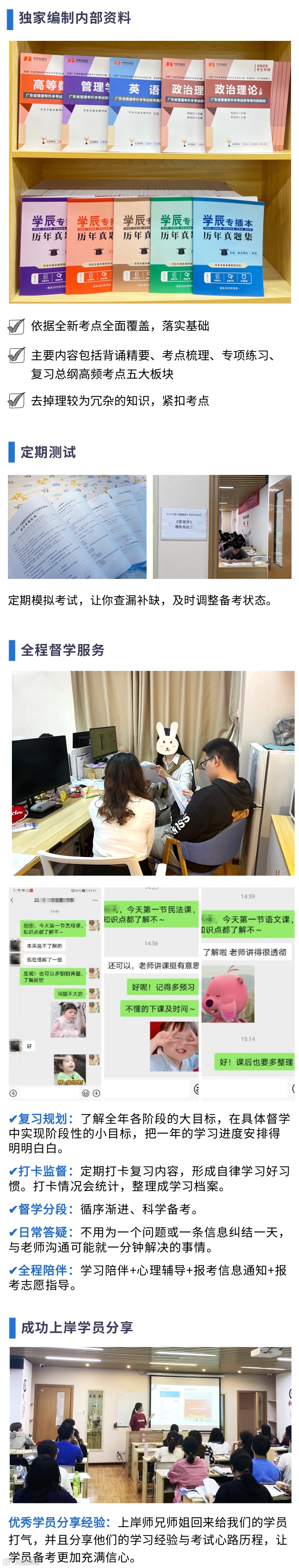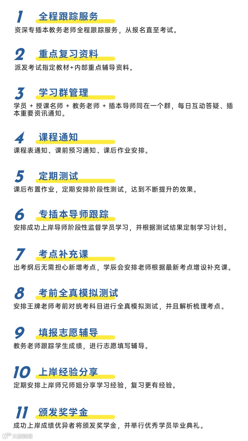学辰的授课教师均为一流名校毕业,拥有多年插本教学经验,有效地帮助考生把握考试重点、明晰核心知识点、有效掌握复习方法、吃透考试内容。为每一位学员提供最优质、最精品的学习服务。