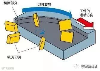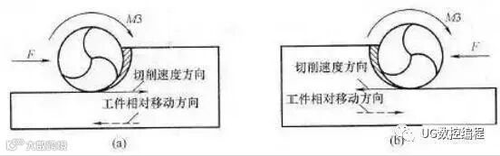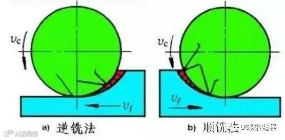 顺铣:是指刀具的切削速度方向与工件的移动方向相同。