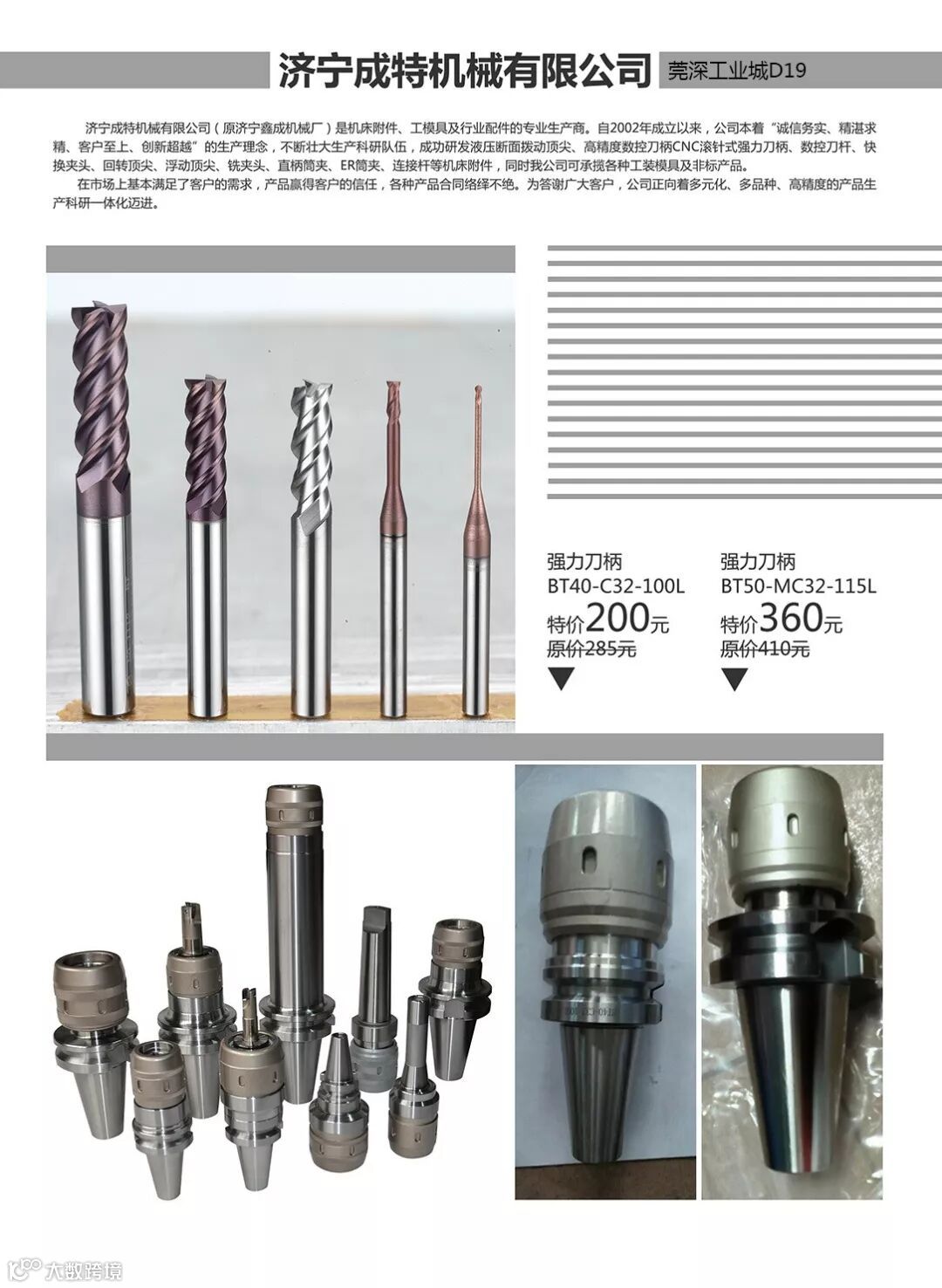 济宁成特机械有限公司(原济宁鑫成机械厂)是机床附件、工模具及行业配件的专业生产商。自2002年成立以来,公司本着至上、创新超越″的生产理念,不断壮大生产科硏队伍,成功硏发液压断面拨动顶尖、高精度数控刀柄CNC滚针式强力刀柄、数控刀杄、快换夹头、回转顶尖、浮动顶尖、铣夹头、直柄筒夹、ER筒夹、连接杄等机床附件,同时我公司可承揽各种工装模具及非标产品。