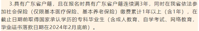 2024年普通专升本新政策招生对象第3点,具有广东省户籍,且在报名时具有广东省户籍连续满3年,同时在我省依法参加社会保险(仅限基本医疗保险、基本养老保险)缴费累计1年以上(含1年),在截止日期前取得国家承认学历的专科毕业生(含成人教育、自学考试、网络教育,毕业证书落款日期在2024年2月底前)。