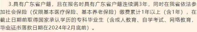 3、在报名时具有广东省户籍连续满3年,同时在我省依法参加社会保险(仅限基本医疗保险、基本养老保险)缴费累计1年以上(含1年),在截止日期前取得国家承认学历的专科毕业生。