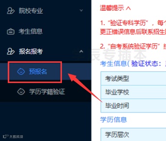 提交成功后,点击左边子菜单的预报名-学历学籍验证,进行学历验证。