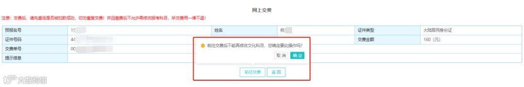 交费后,请先查询是否被扣款成功,切勿重复交费!并且缴费后不允许再修改报考科目,所交费用一律不退!