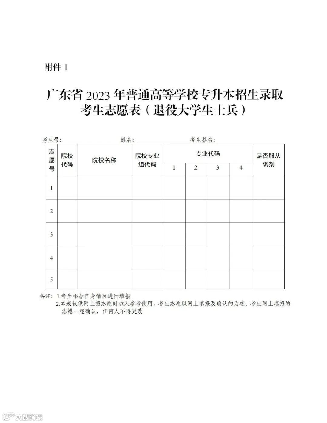 1.广东省2023年普通高等学校专升本招生录取考生志愿表(退役大学生士兵,样式)