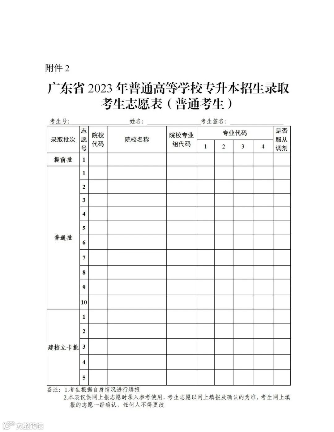 2.广东省2023年普通高等学校专升本招生录取考生志愿表(普通考生,样式)