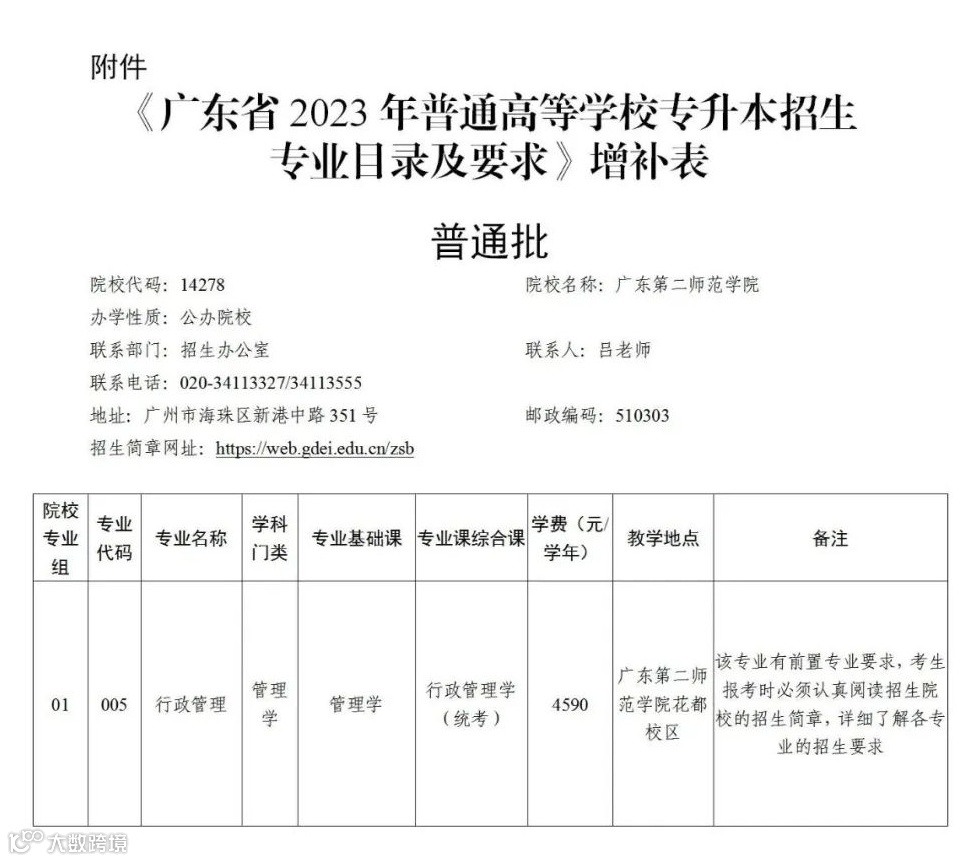 应广东第二师范学院要求,现对《广东省2023年普通高等学校专升本招生专业目录及考试要求》作如下增补(见附件)。