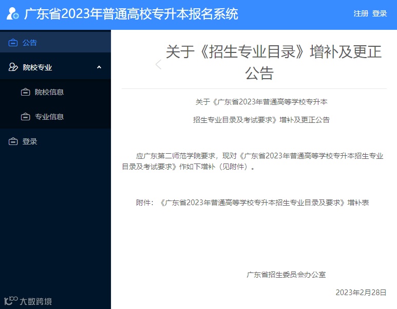 广东省2023年普通高校专升本报名系统发布了《关于《招生专业目录》增补及更正公告》,公告内容如下: