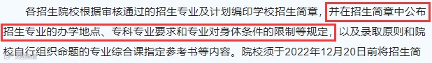 考生填报志愿时,须详细了解各招生院校招生专业的办学地点、前置专科专业和专业对身体条件的限制等要求。