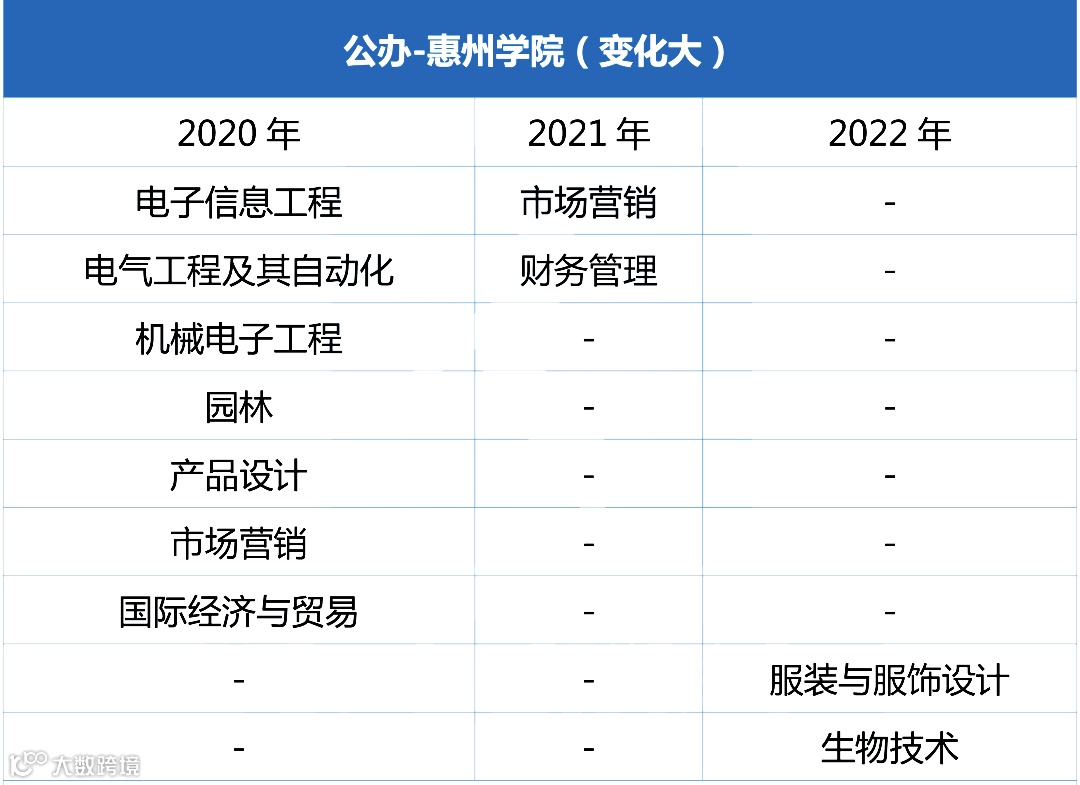 对于想要报考惠州学院的考生来说,由于该院校3年的招生专业变化太大,所以不太建议考生只盯着惠州学院报考,多做两手准备,因为很有可能明年不招收这些专业了。