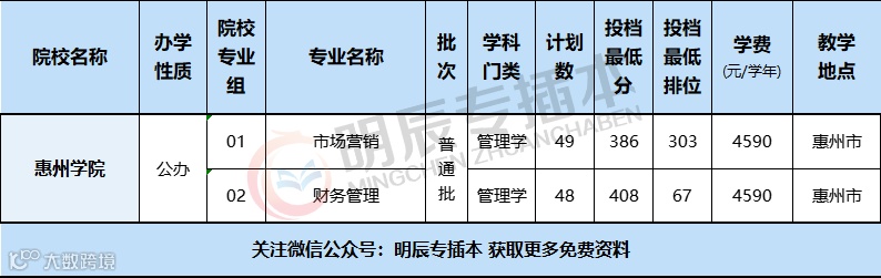 2021年惠州学院缩招为2个专业:市场营销和财务管理,没有专业限制且均为统考,所以录取平均分高达397分;其中财务管理达到了惊人的408投档分,是2022年最难考的专业。