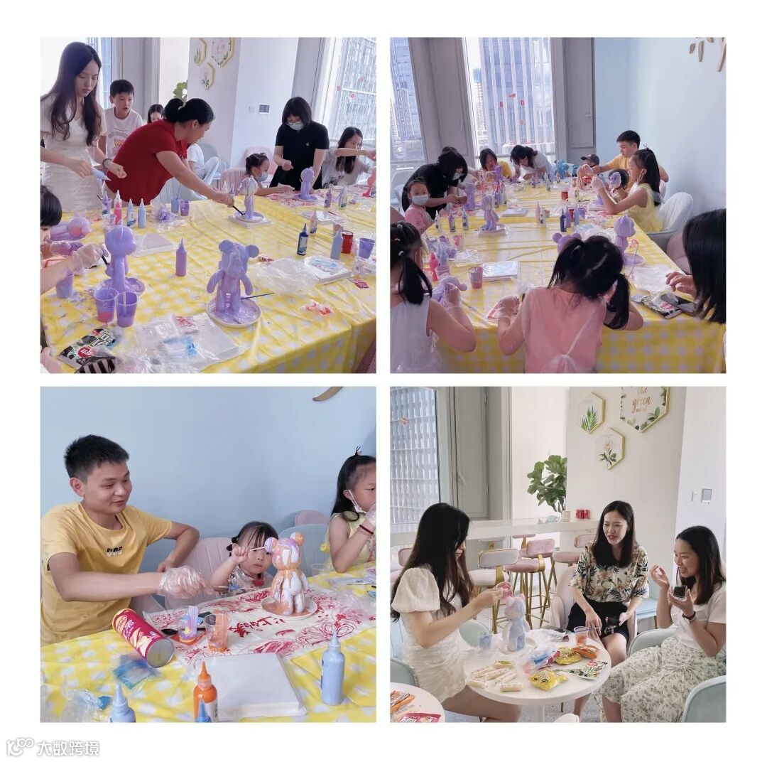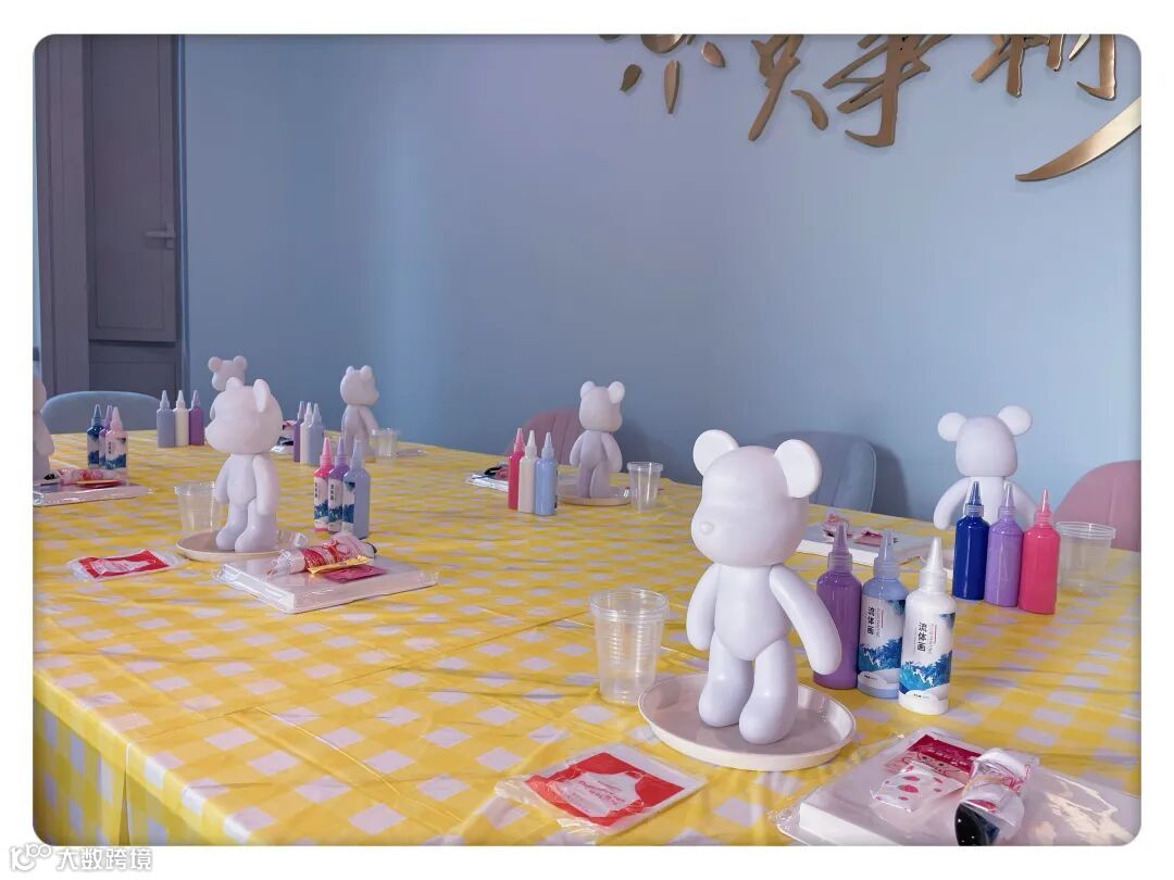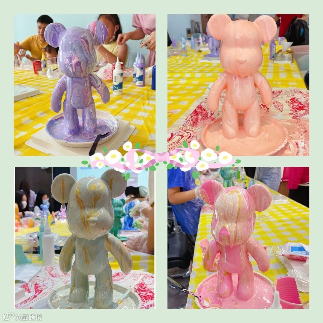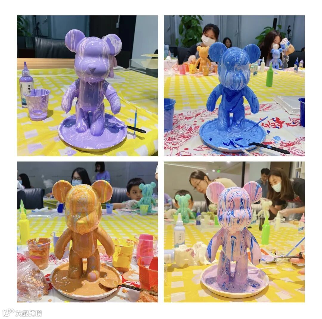 DIY流体熊活动是对白色熊坯进行艺术制作,从多种颜料当中选择自己心仪的颜料,混合调色后淋浇,从而获得一个属于自己独一无二的流体熊。