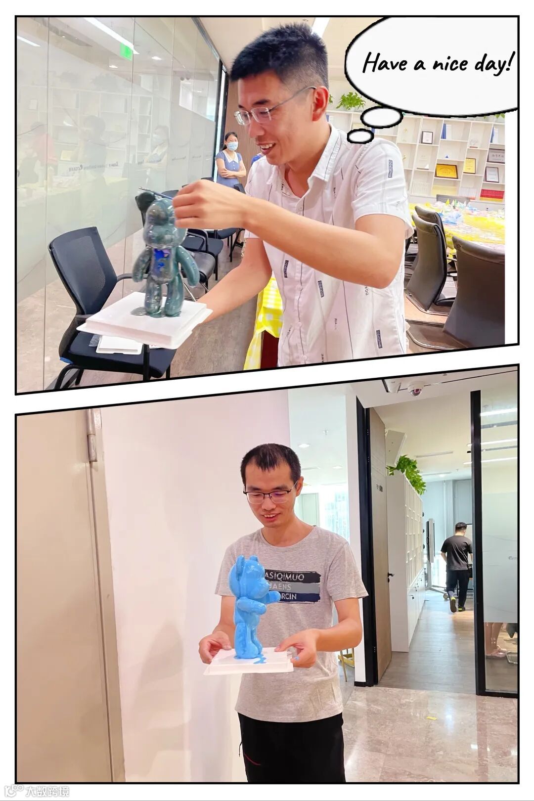 活动期间,老师向同事们讲解了流体熊的制作流程,并展示了做好的流体熊成品。随后让大家各自挑选了几种自己喜欢的颜色,戴好手套和围裙,开始动手调颜色。在给小熊上颜色的时候,老师耐心的告诉大家一定要先从小熊的脖子部位开始淋颜料,脖子以下淋好之后再从头部开始上色,这样就能确保各个部位都能均匀的涂上颜色。随着流体颜料的流动性,花纹在制作过程不断变化,挥洒颜料的解压感加上艺术创作的小心翼翼,带给大家一种特别的体验。
