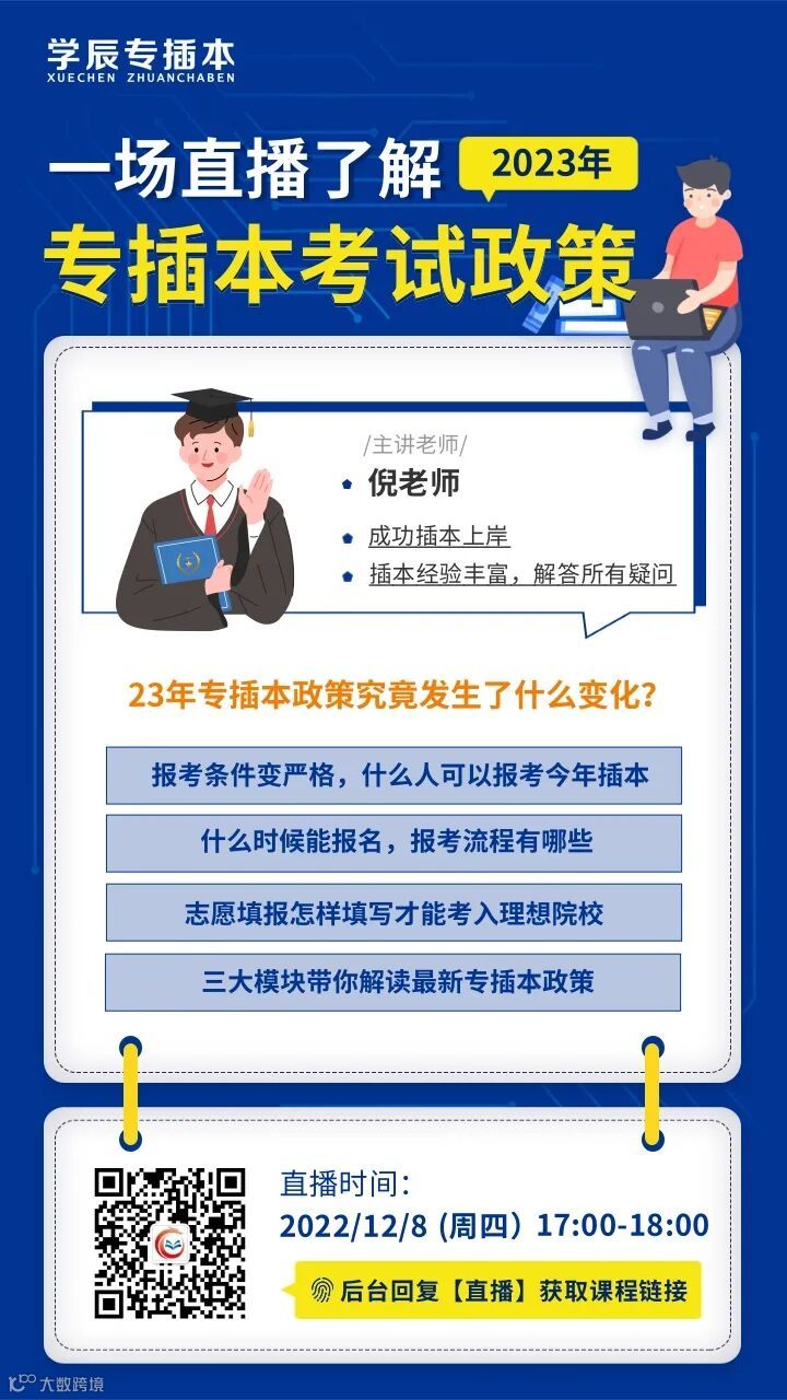 为了帮助第一次报考专插本的同学能顺利考试,我们针对23年招生工作规定举行一场直播,为大家详细解读专插本政策+学习备考建议,大家千万不要错过哦!
