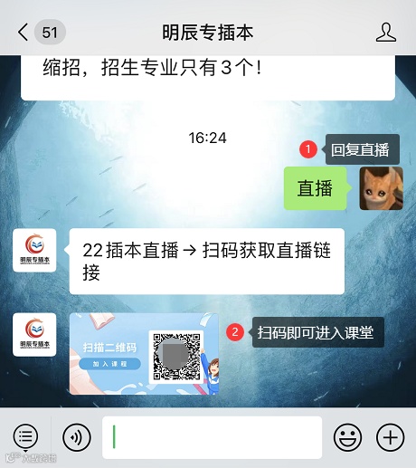 关注【明辰专插本】后台回复【直播】获取二维码,扫码直接进入课堂