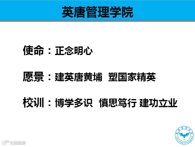 回顾英唐管理学院成立的精彩瞬间,钟勇斌校长介绍了英唐管理学院成立的背景、目的,解读了英唐管理学院的使命、愿景以及校训。通过“学习修悟”这四个字的意义阐述,期望参加学习的同学们有正确的想法、正确的智慧,未来能够建功立业!