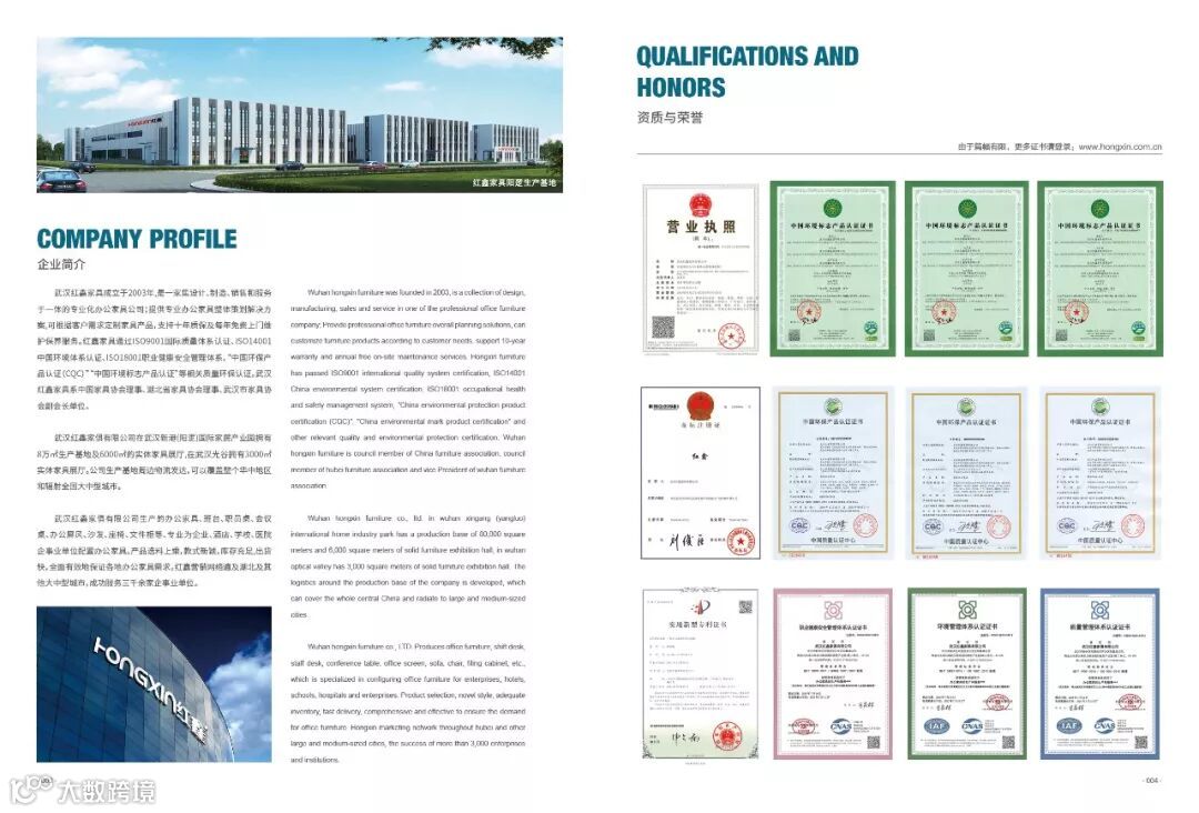 武汉红鑫家具成立于2003年,注册资金1050万元,是一家集设计、制造、销售和服务于一体的专业化办公家具公司;提供专业办公家具整体策划解决方案,可根据客户需求定制家具产品,支持十年质保及每年免费上门维护保养服务。红鑫家具通过ISO9001国际质量体系认证、ISO14001中国环境体系认证、ISO18001职业健康安全管理体系,“中国环保产品认证(CQC)”“中国环境标志产品认证”等相关质量环保认证。武汉红鑫家具系中国家具协会理事、湖北省家具协会理事、武汉市家具协会副会长单位。