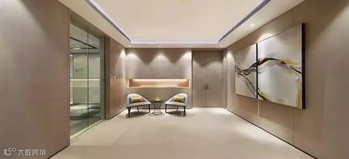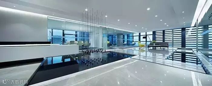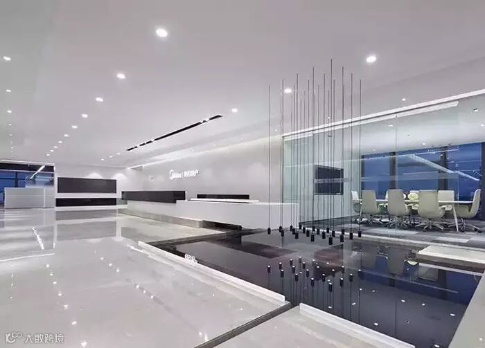 接待区的设计尽可能地将空间跨度往两侧延伸,大型液晶拼屏作为一侧的端景,滚动播放企业宣传视频,同时也是接待区与办公区的空间隔断;暖灰大理石和大尺度铝板体现出大气、精致的空间气质;水景的融入烘托出宁静致远的气氛,结合开放通透的洽谈室,让视线可以心旷神怡的延伸至远方,传达出美的地产对于人与城市、人与自然和谐共生的品牌理念。