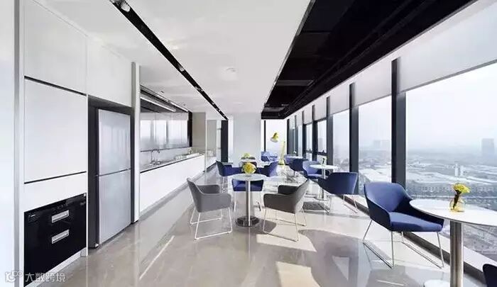 职员办公区可容纳70人同时办公,并利用渐变玻璃作半围合隔断,在形成独立总监办公区的同时,还能让所有员工享受窗外风景。白色与浅灰的办公家具搭配跳跃的拼色地毯,营造严谨而活泼的办公氛围。在连接办公区与接待区的一侧,设有茶水区,配备多组桌椅,并拥有开扬的180度景观视野,员工们可以在这里自由交流,享受工作,随着视线往城市天际的推移,心境也将随之改变。