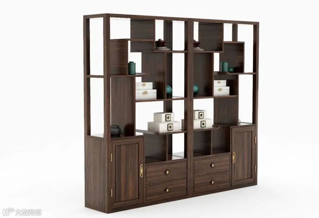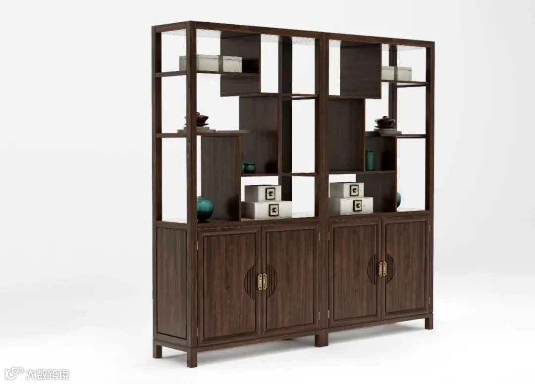 3.此款博古架采用左右柜体对称设计,框架刚性坚韧,柜门线条圆润和谐,极富动感韵味,形似万字纹和步步高锦纹,彰显中式文化底蕴,寓意步步高升、富贵不断、万事如意。
