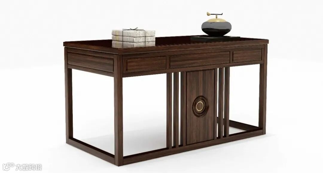 1.书桌造型清雅隽秀,直棂元素与实木板虚实结合,桌下方正中涟漪中间嵌入铜饰件,寓意福寿延绵,意境妙不可言。整体上方中有圆,方圆有度,刚柔相济,如君子之处事态度,透露出一种华贵的典雅气质,为我们营造了一个安静而雅致的学习办公环境、